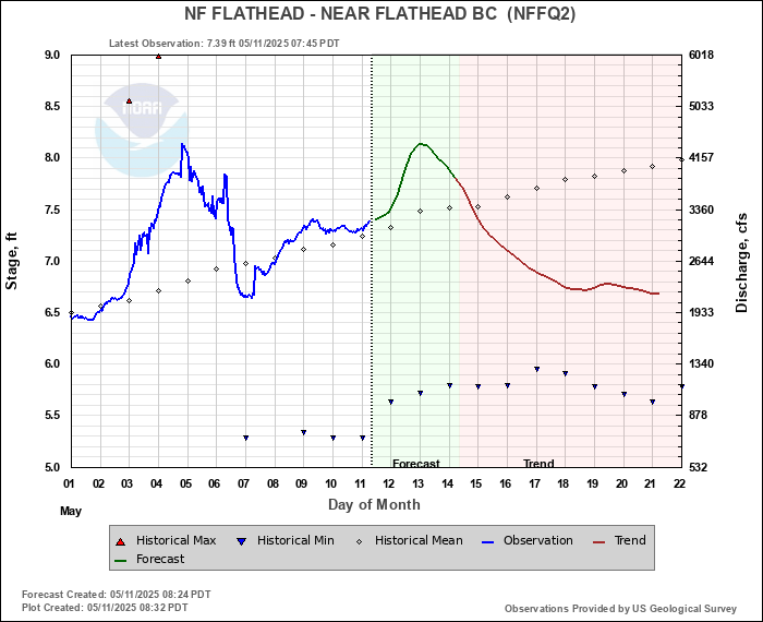 Daily Historical Statistics for February 14, 2026 Mean Stage: 4.16 ft Mean Flow: 171 cfs Max Stage: 5.48 ft Max Flow: 818 cfs (2015) Min Stage:  3.69 ft Min Flow: 70 cfs (2001)