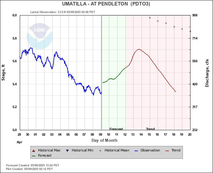 Daily Historical Statistics for February 14, 2026 Mean Stage: 5.96 ft Mean Flow: 846 cfs Max Stage: 8.39 ft Max Flow: 3540 cfs (1945) Min Stage:  4.59 ft Min Flow: 101 cfs (1977)