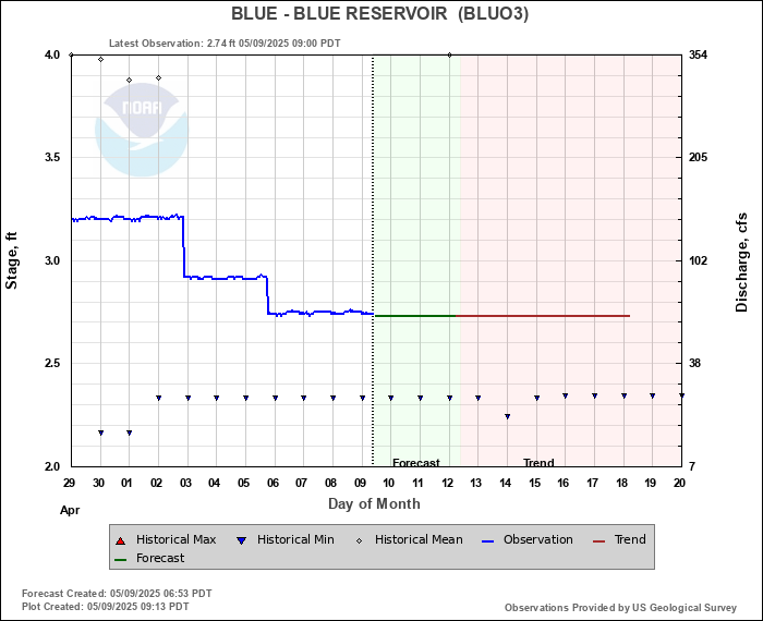 Daily Historical Statistics for December 28, 2025 Mean Stage: 5.03 ft Mean Flow: 805 cfs Max Stage: 7.25 ft Max Flow: 2680 cfs (1982) Min Stage:  2.61 ft Min Flow: 45 cfs (1990)
