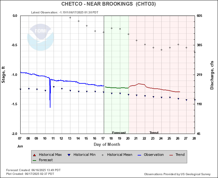 Daily Historical Statistics for February 11, 2026 Mean Stage: 3.68 ft Mean Flow: 3270 cfs Max Stage: 9.19 ft Max Flow: 12600 cfs (1979) Min Stage:  -1.37 ft Min Flow: 147 cfs (1977)