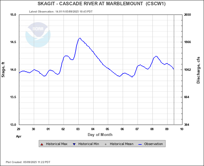 Daily Historical Statistics for March 24, 2026 Mean Stage: 13.01 ft Mean Flow: 911 cfs Max Stage: 15.28 ft Max Flow: 4460 cfs (2007) Min Stage:  11.83 ft Min Flow: 311 cfs (2023)