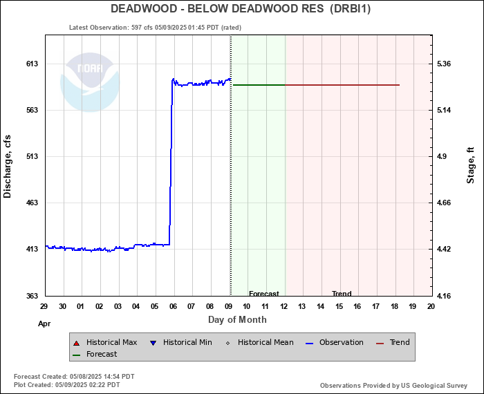 Daily Historical Statistics for February 05, 2026 Mean Stage: 1.80 ft Mean Flow: 25 cfs Max Stage: 4.18 ft Max Flow: 371 cfs (1997) Min Stage:  0.86 ft Min Flow: 0 cfs (1934)