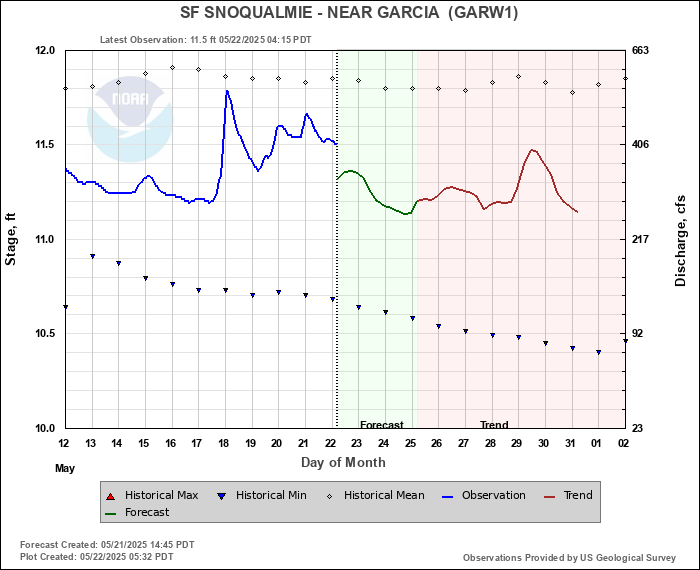 Daily Historical Statistics for January 01, 2026 Mean Stage: 10.72 ft Mean Flow: 294 cfs Max Stage: 12.97 ft Max Flow: 1810 cfs (2020) Min Stage:  9.84 ft Min Flow: 64 cfs (1988)