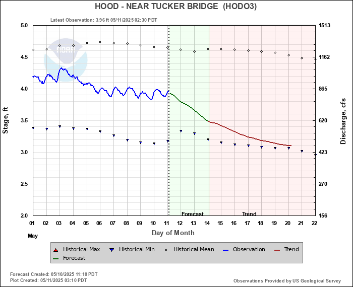 Daily Historical Statistics for January 08, 2026 Mean Stage: 5.28 ft Mean Flow: 1550 cfs Max Stage: 9.97 ft Max Flow: 7610 cfs (1983) Min Stage:  2.53 ft Min Flow: 220 cfs (1979)