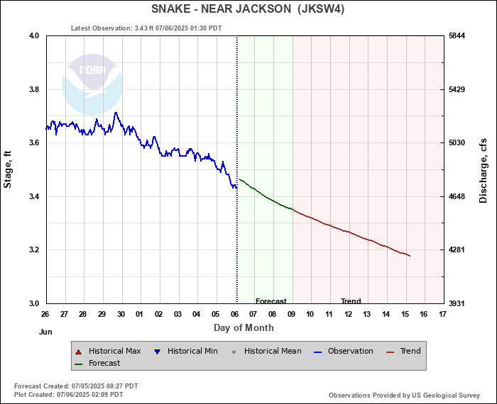 Daily Historical Statistics for February 15, 2026 Mean Stage: 1.05 ft Mean Flow: 1310 cfs Max Stage: 2.19 ft Max Flow: 2640 cfs (1997) Min Stage:  0.56 ft Min Flow: 780 cfs (1989)