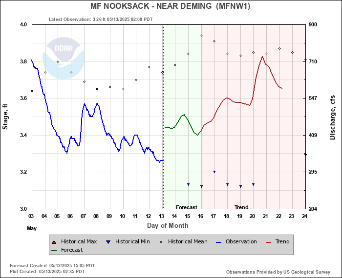 Daily Historical Statistics for January 08, 2026 Mean Stage: 3.78 ft Mean Flow: 695 cfs Max Stage: 6.61 ft Max Flow: 5500 cfs (2009) Min Stage:  2.58 ft Min Flow: 73 cfs (1993)