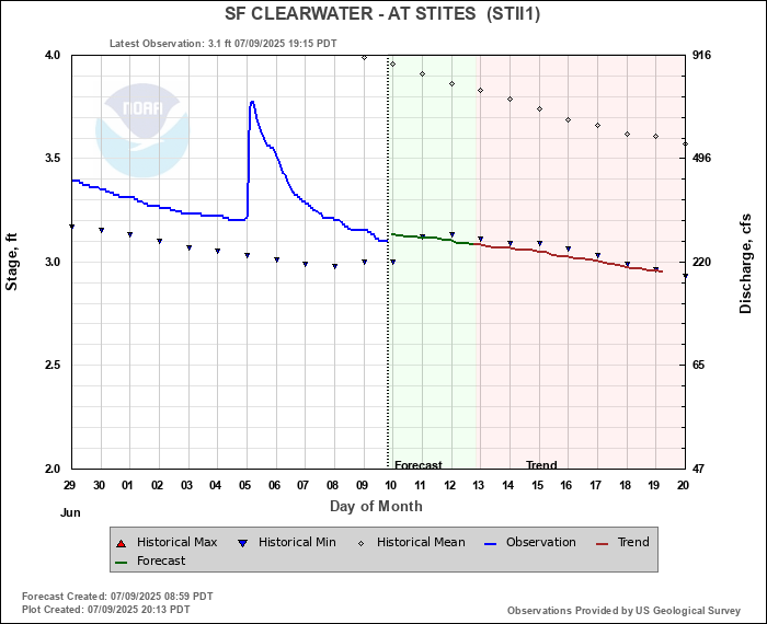 Daily Historical Statistics for January 01, 2026 Mean Stage: 3.23 ft Mean Flow: 449 cfs Max Stage: 6.80 ft Max Flow: 6570 cfs (1997) Min Stage:  2.39 ft Min Flow: 85 cfs (1988)