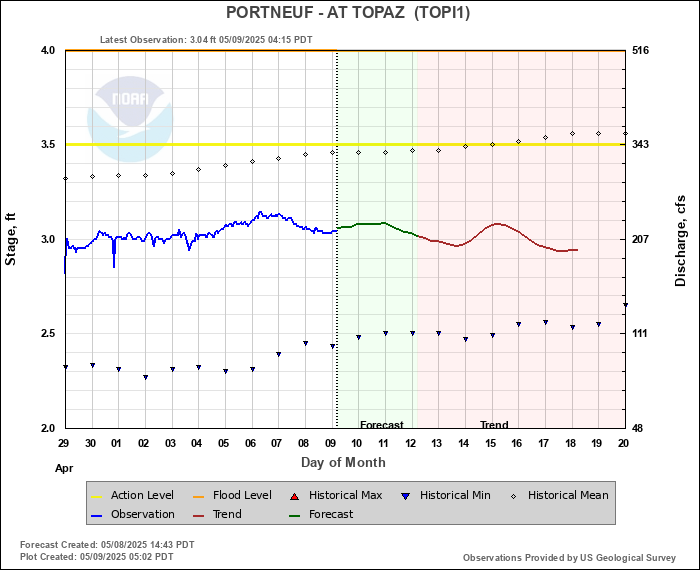 Daily Historical Statistics for January 05, 2026 Mean Stage: 2.76 ft Mean Flow: 142 cfs Max Stage: 3.33 ft Max Flow: 272 cfs (1985) Min Stage:  2.41 ft Min Flow: 86 cfs (2014)