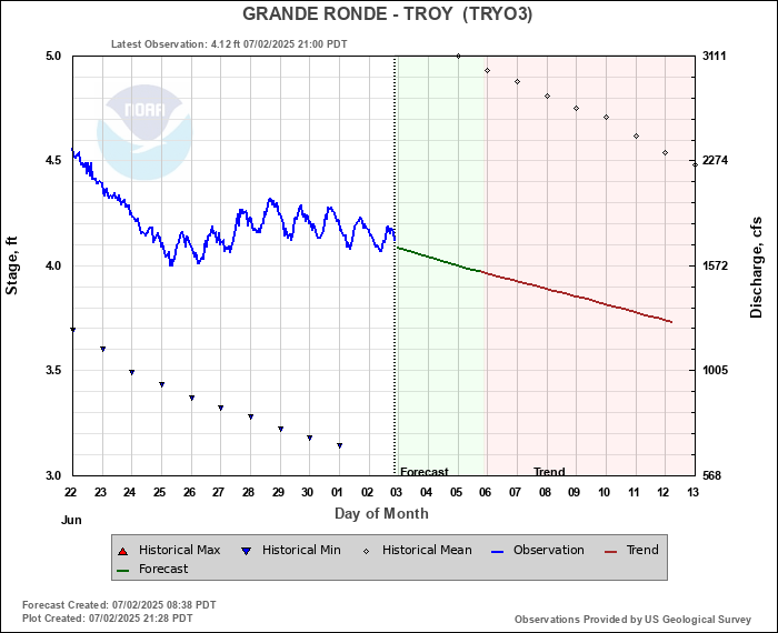 Daily Historical Statistics for January 01, 2026 Mean Stage: 4.22 ft Mean Flow: 1930 cfs Max Stage: 11.36 ft Max Flow: 28000 cfs (1997) Min Stage:  2.78 ft Min Flow: 450 cfs (1979)