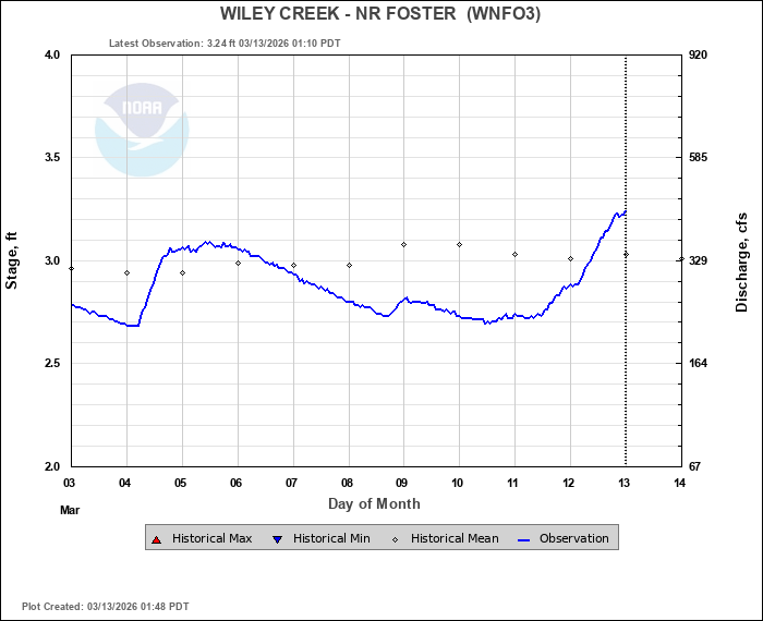 Daily Historical Statistics for March 12, 2026 Mean Stage: 3.01 ft Mean Flow: 335 cfs Max Stage: 4.38 ft Max Flow: 1220 cfs (2002) Min Stage:  1.74 ft Min Flow: 38 cfs (2005)