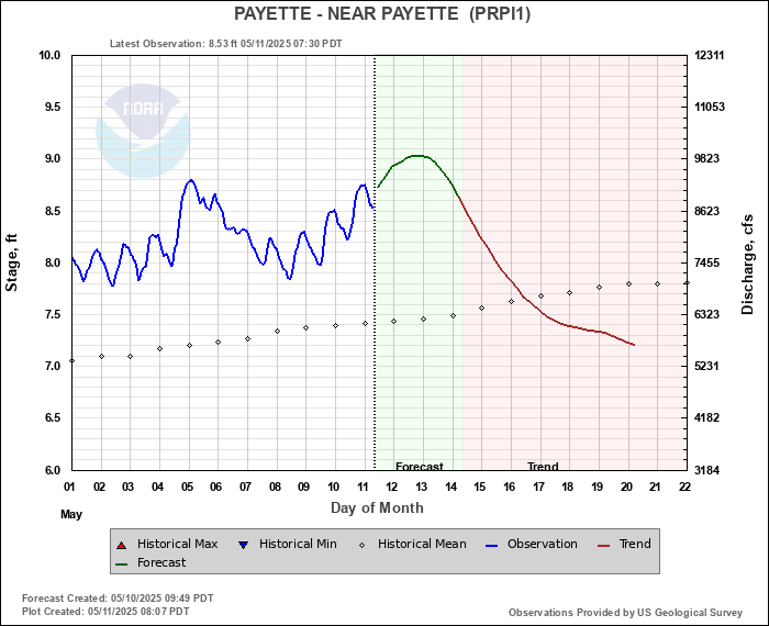 Daily Historical Statistics for January 24, 2026 Mean Stage: 5.49 ft Mean Flow: 2090 cfs Max Stage: 8.60 ft Max Flow: 8870 cfs (1970) Min Stage:  4.56 ft Min Flow: 800 cfs (1937)