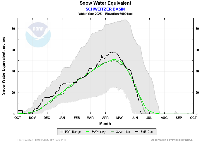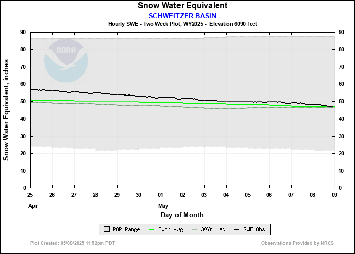 Accumulated Precipitation, Snow Depth, Snow Density and Temperature graphs are no longer displayed by the NWRFC starting June 2025. Links to the respective data collection agencies where similar information can be obtained are found below.